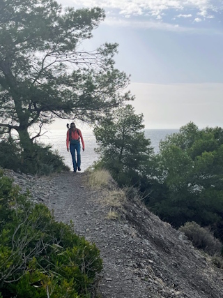De officiële route terug is langs de MA5105, maar daar hebben we geen trek in en we kiezen ervoor om opnieuw over de betonweg te lopen. Het is geen straf, want de terugweg ziet er altijd anders uit dan de heenweg. Voor ons zien we de Middellandse Zee liggen.